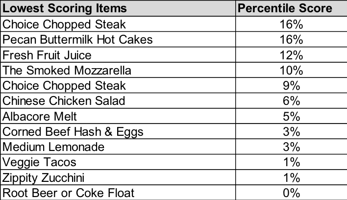 We reported the percentiles to the Johnny’s management team. The initial report, given that Johnny’s wants to cut items from the menu, is shown below. Table 2 shows the bottom 12 items by item-weight percentile.