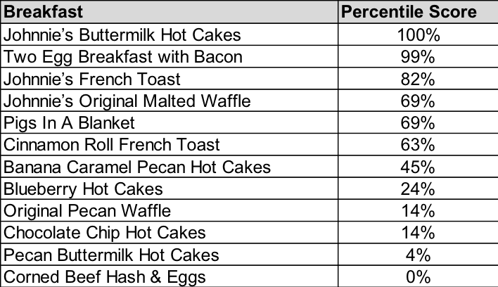 The production of percentiles for item weights is also very flexible. Johnny’s would like us to filter the item weights by only those who visited the restaurant for breakfast. Moreover, they would like to see only breakfast items in the percentile chart. Table 3 shows the percentile output of this filtered request.