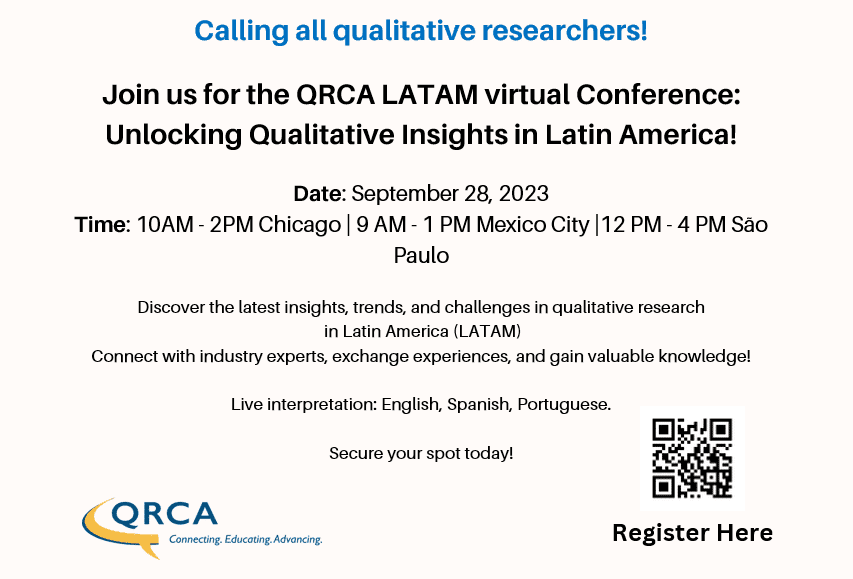 The QRCA is bringing Latin America to you! The first ever QRCA LATAM virtual conference Unlocking Qualitative Research Insights in Latin America is taking place on September 28th. For researchers…