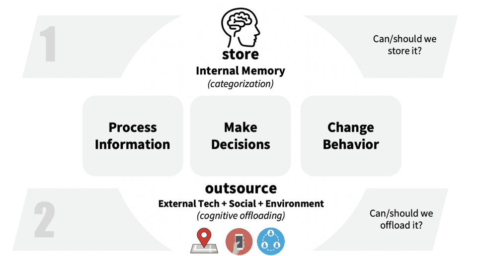 My ex-girlfriend used to get furious at me for never remembering our anniversary date. I never felt the need to remember when I could simply store the date in my iPhone and automatically be reminded — no memory needed! What’s interesting is that I still remember the phone number of my first high school girlfriend. We all can relate to how we used to remember information which now we have the technology to outsource our memory. For example, we use Facebook to offload remembering friends’ birthdays and use Google maps instead of remembering directions. With the rise of technology, we no longer have to remember information, and it’s actually quicker, more efficient and easier to outsource cognition.
