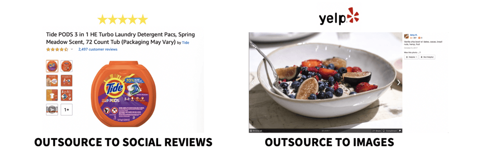 There are many ways marketers can help customers offload cognition but one of the most powerful is the social proof of customer reviews. If 10,000 people like it, I must like. We all are familiar with making decisions for Amazon purchases without even looking at the product, but just reviews. 5 stars signals the safe choice. Another example is with taking pictures of our food. Customers are less looking to menu’s and outsourcing information from photos (think yelp or stored photos in our smartphones. Infusing customer reviews into our websites and on packages is a powerful shortcut to outsource cognition to others helping short-cut our decision time.